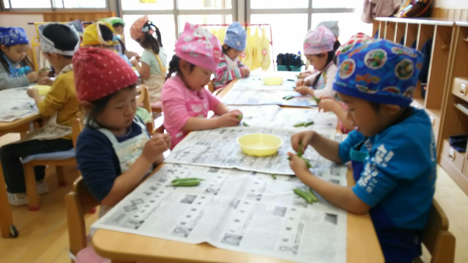 水曜日のクッキングの日のもも組の様子です。 さやの外側からみて、 中身がいくつ入っているか クイズをしました。 先生が、もっていたさやからは「8個」がでてきました。
